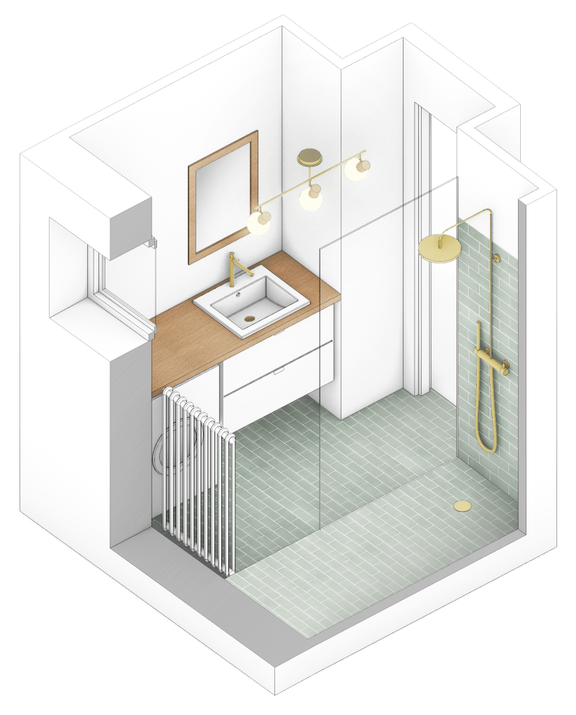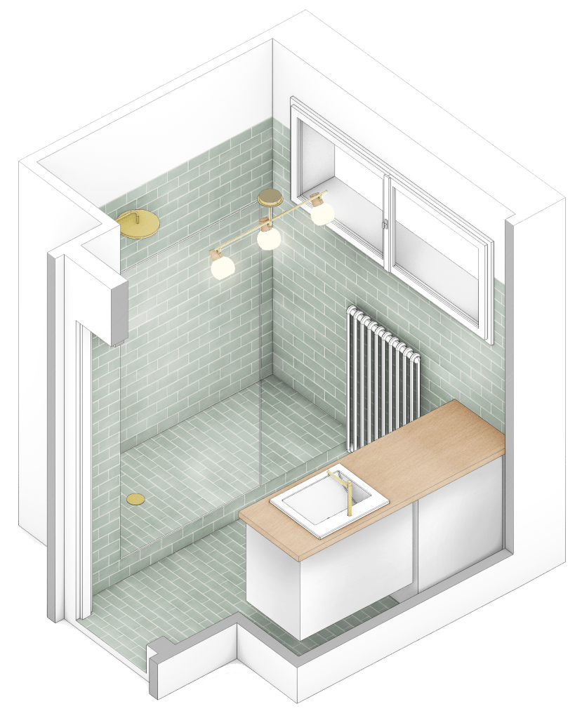 aufrèry aufrèry agencement d’une salle d’eau lieu Toulouse (31)livraison 2021superficie 4 m2maîtrise d’ouvrage privée intervention agencement & mobilierspécificité exiguïté & laitonmission esquissecoût 4000 €