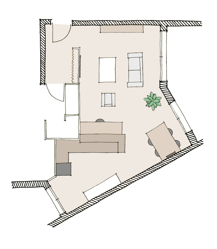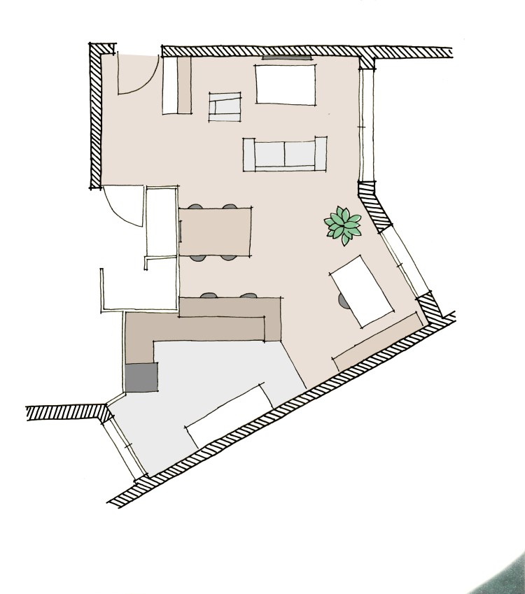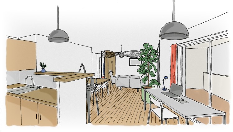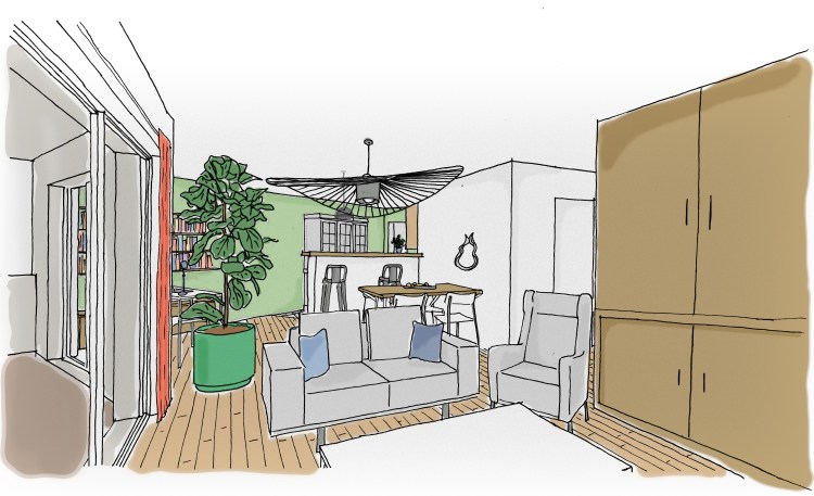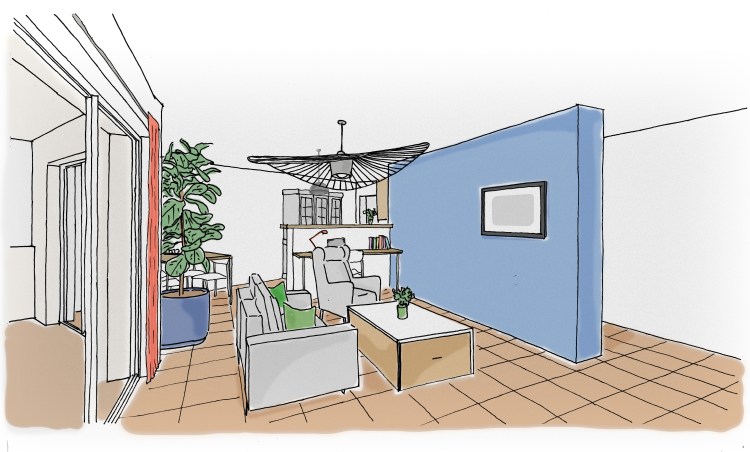 Hermes hermes réaménagement d’un salon T3 lieu La Seyne-sur-mer (83)livraison 2022superficie 40 m2maîtrise d’ouvrage privé intervention agencement & mobilier spécificité rénovation légèremission esquissecoût 10 000 euros